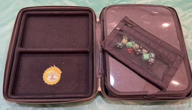 This specially designed DnD Fest, this RPG Character Organizer Case comes in a sleek black finish with the DnD Fest logo prominently displayed on the cover. It features a built-in dice tray and a range of compartments to keep your gaming essentials organized. Perfect for keeping your character ready for adventure, whether for yourself or as a gift!