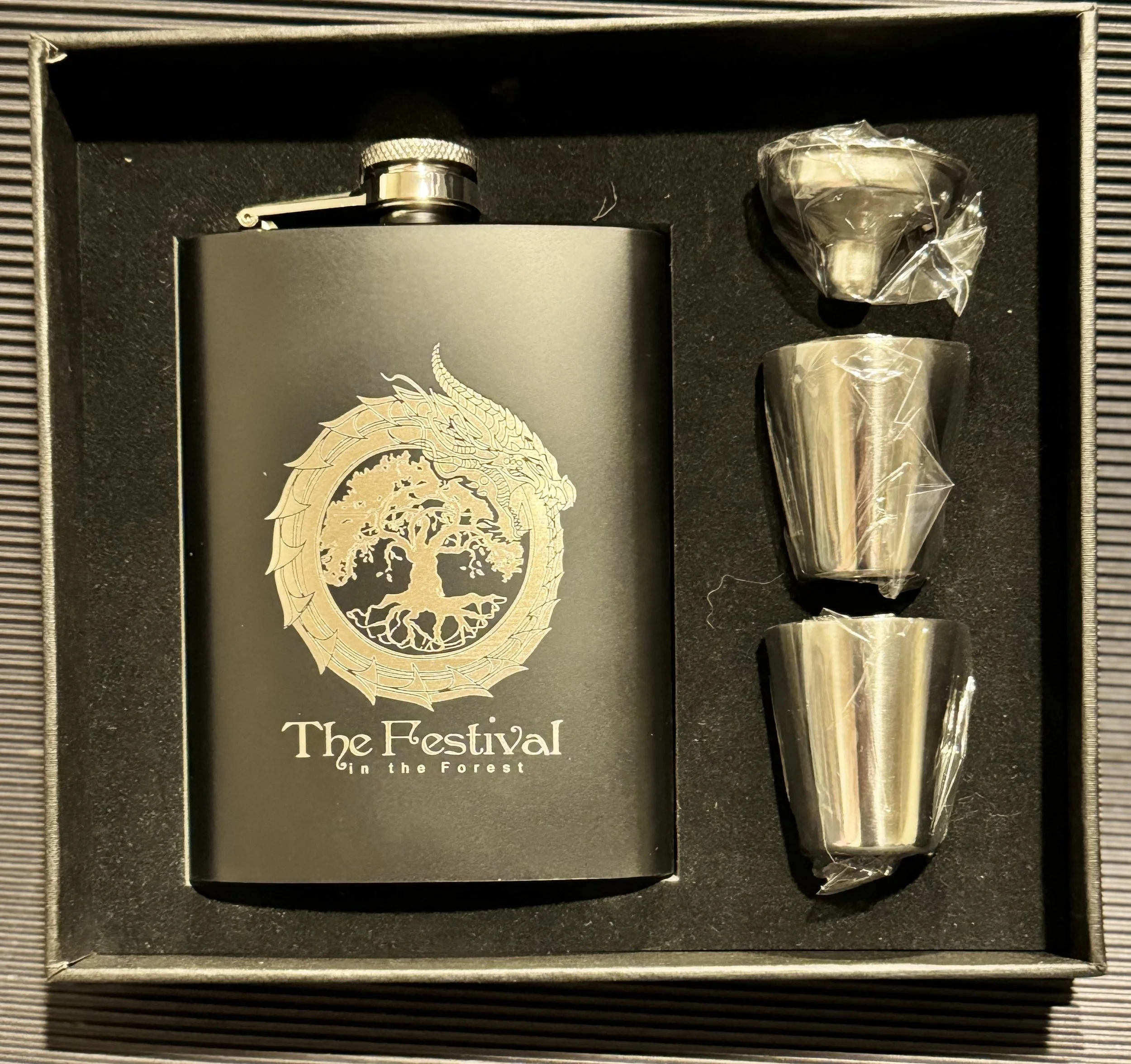 Step into the realm of mystical libations with "The Festival: Spirits in the Forest" Flask Set. This set is a must-have for any D&D enthusiast looking to add a touch of enchantment to their gaming sessions or festive gatherings. The sleek, black flask is adorned with a striking emblem featuring our logo—a symbol that evokes the spirit of adventure and the mystique of the forest. Accompanying the flask are two shiny stainless steel shot glasses, perfect for sharing a toast with your fellow adventurers.